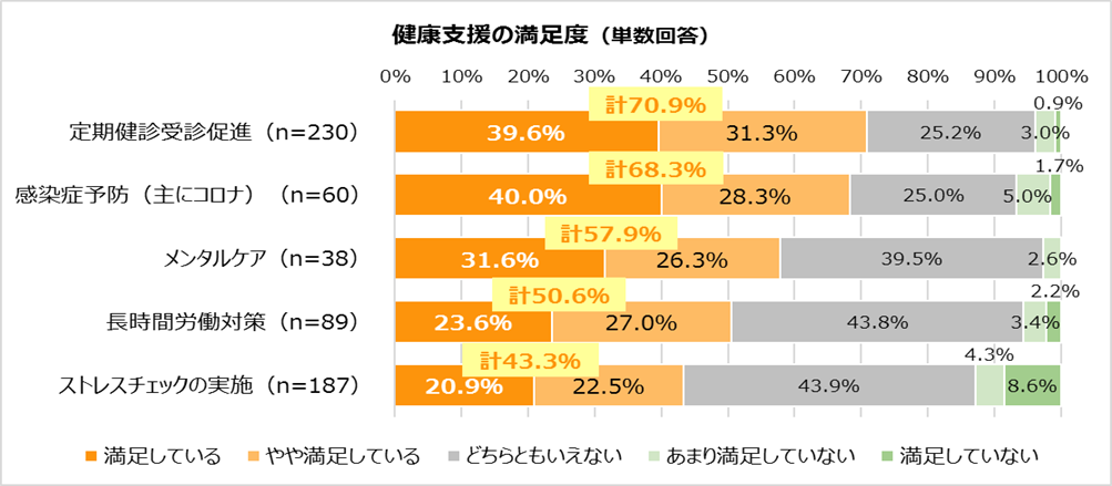 ・満足度に関しては「定期健康受診促進」が70.9%に対し、「長時間労働対策」は50.6%、「ストレスチェックの実施」は43.3%と半数程度にとどまった。