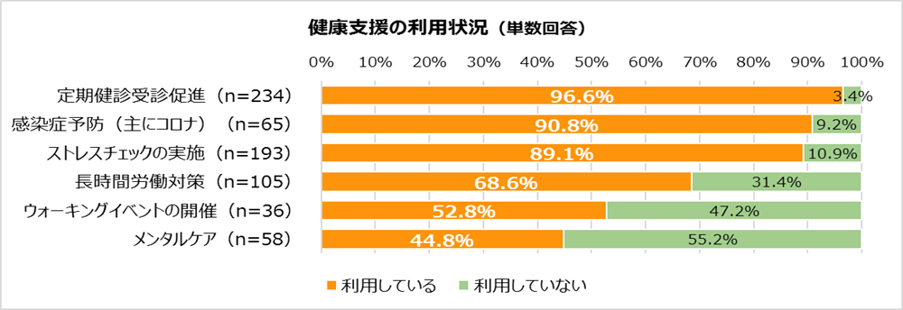・従業員の健康支援の利用状況は、「定期健康受診促進」の利用率が96.6%と最も高い。一方、「ウォーキングイベントの開催」や「メンタルケア」は利用率が半数程度にとどまっていることから、各施策の利用状況には差があることがわかった。