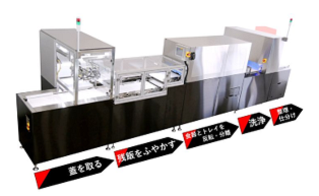 食器とトレイの反転・分離、洗浄、仕分けを全自動で処理。負担が大きい作業を自動化し、作業員の数を大幅に削減。