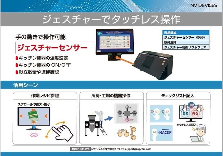 タッチレスで手の動きで画面操作が可能。画面の拡大縮小や、360℃回転、上下左右のスライド操作ができ、非接触で数値入力が行えるため、 衛生的でHACCP管理などにも利用可能。