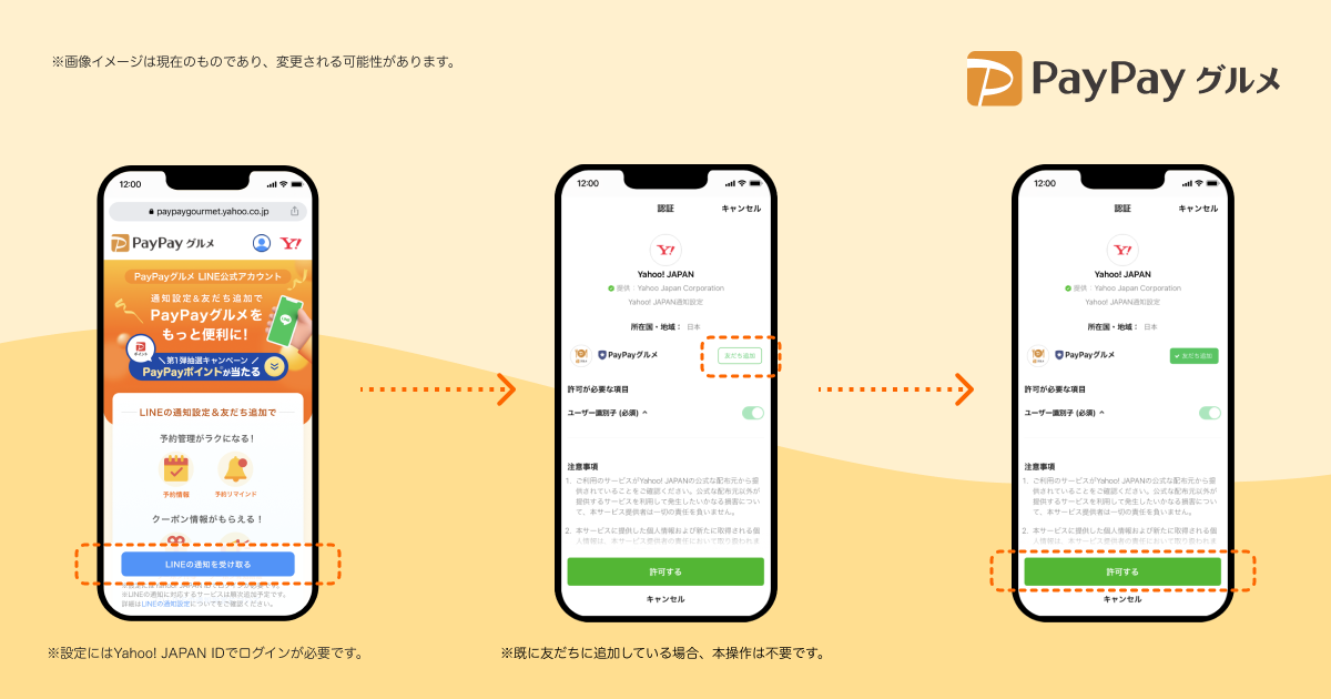 ・以降、設定したものと同じYahoo! JAPAN IDでログインした状態で「PayPayグルメ」にて予約すると、ユーザーの予約情報や保有するクーポンの有効期限などがLINEの通知で受け取り可能に