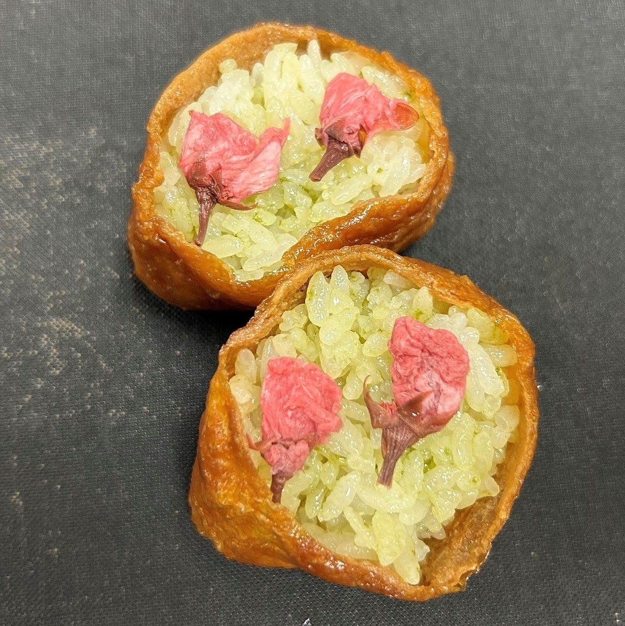 抹茶風味の酢飯に桜花を飾った、春色の稲荷寿司です。