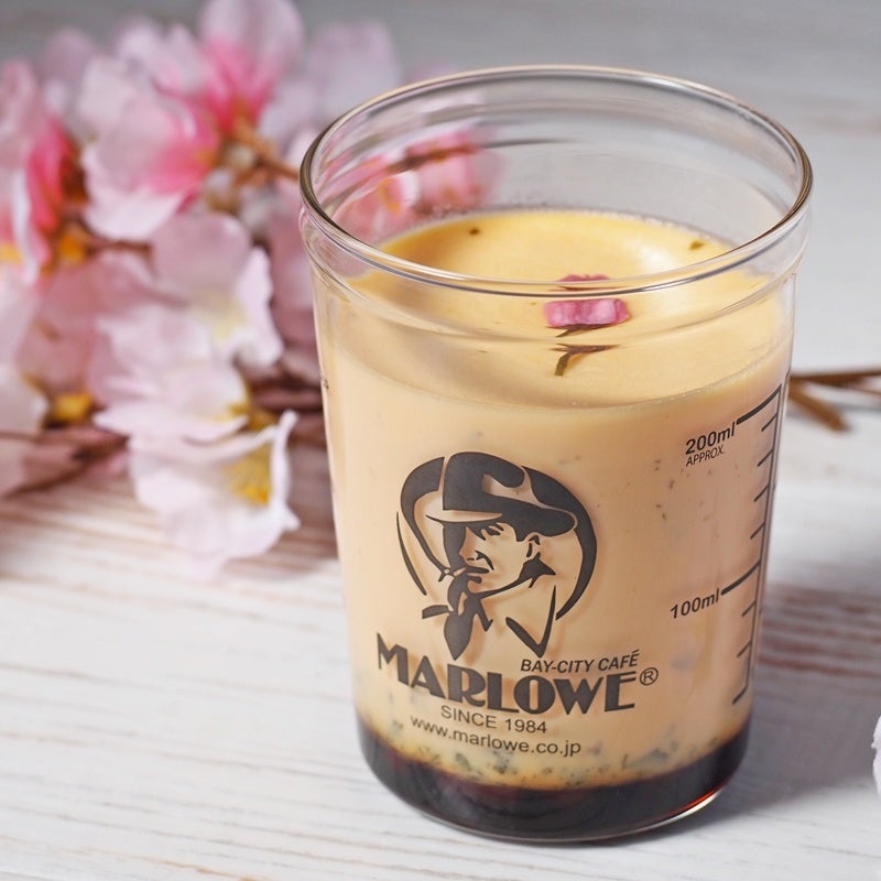 塩漬けの桜の葉と花を使ったプリン。底には丹波大納言のぬれ甘納豆を入れプリン生地にはアクセントに桜の葉の塩漬けを。