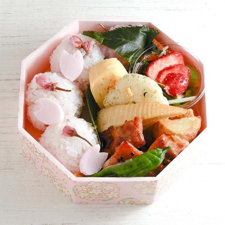 桜花の塩漬けを添えたおむすびと、若鶏きじ焼きや菜の花ごま和えなどを盛り込んだ春のお弁当。