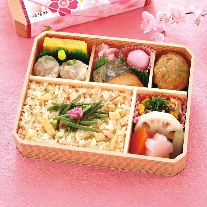 桜の花と山せりを飾った筍ごはんや、鰆、ふき、菜の花など、この季節ならではの春を感じるお弁当。