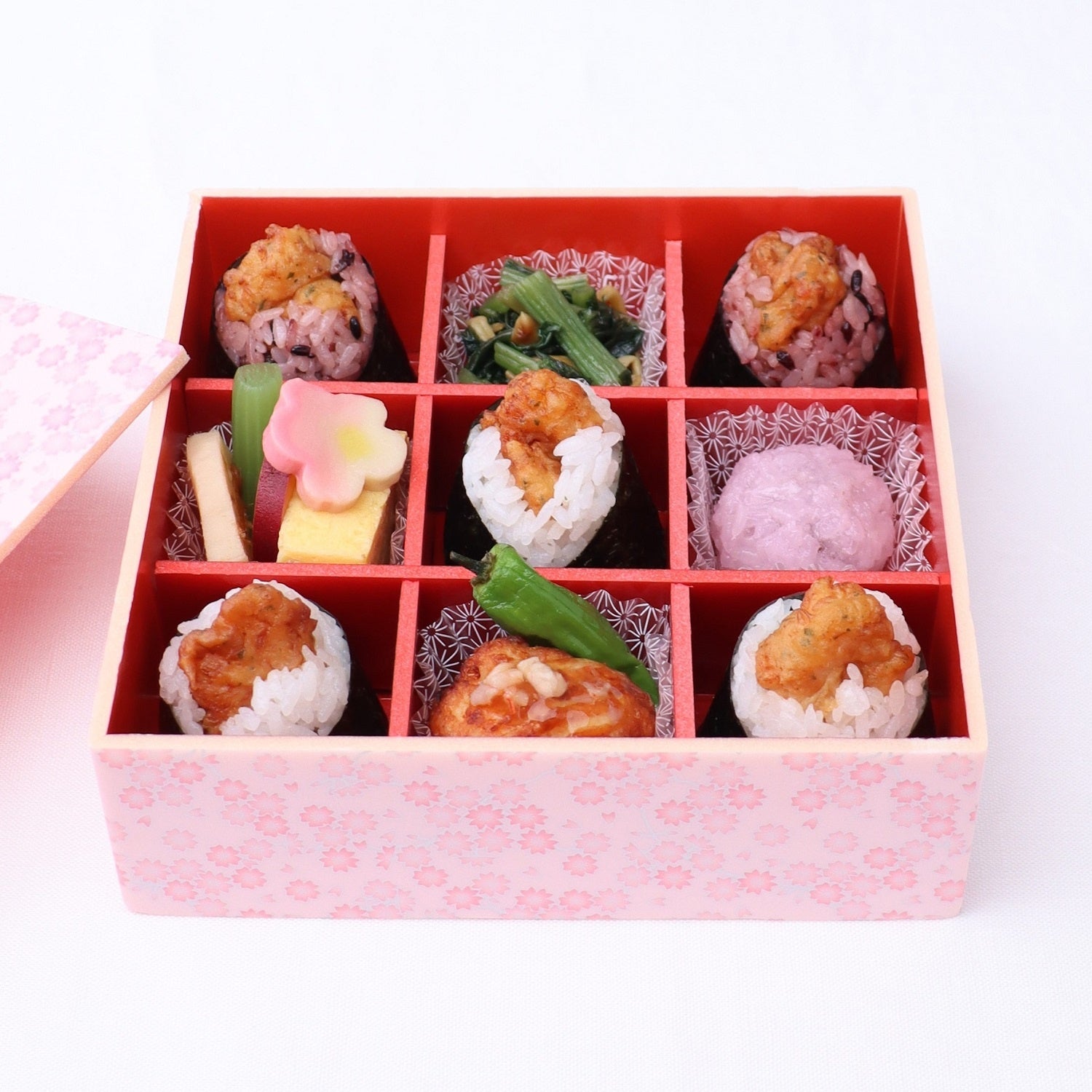 升目で仕切った桜柄の折箱に、天むすや春らしいおかずを少しずつ詰め合わせたお弁当。