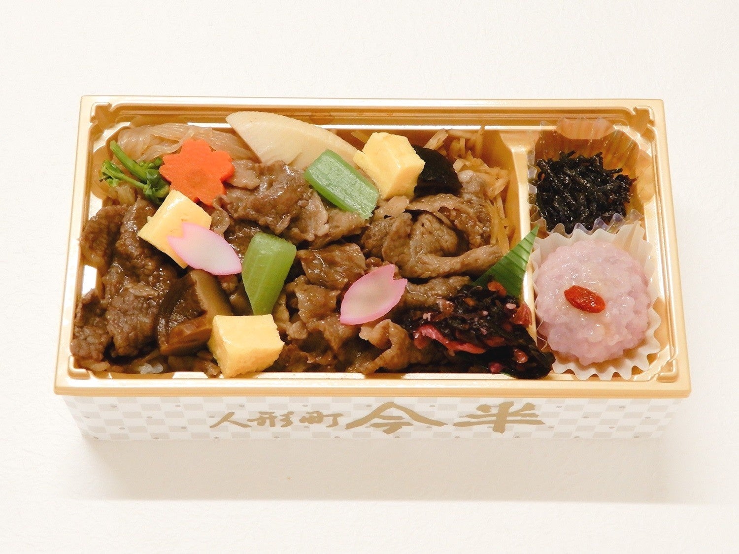 黒毛和牛のすき焼きに、ふきやたけのこを散りばめました。食後には桜餅も。