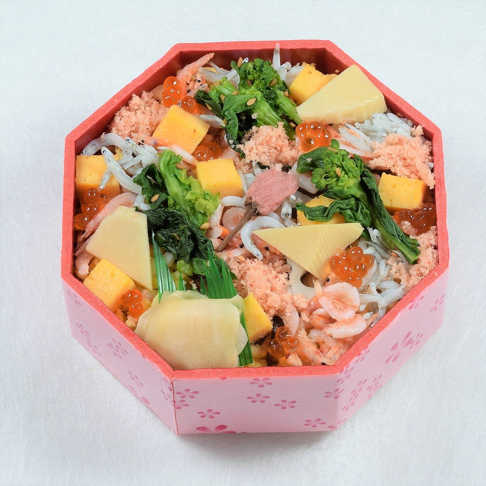 桜えびや釜揚げしらす、菜の花などの春の食材を彩り豊かに飾ったちらし寿司です。