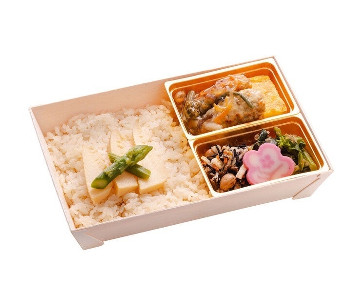 たけのことアスパラガスをのせただし炊き込みご飯、山菜のあんをかけた豆腐ハンバーグや菜の花のおかか和えなど、春の食材を詰め合わせたお弁当です。