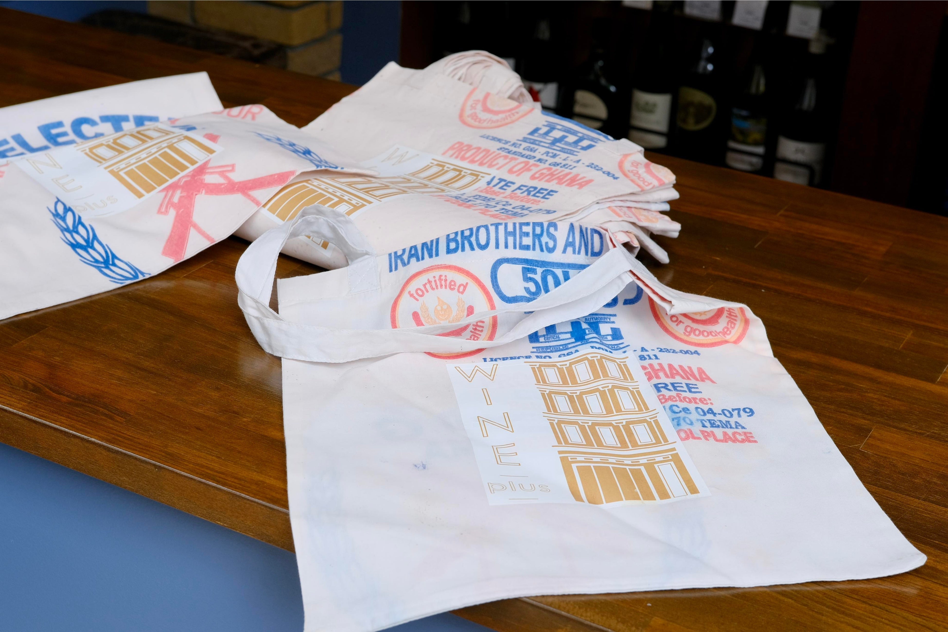 *エコバックは現地で使われた小麦粉の袋をアップサイクルして活用しています