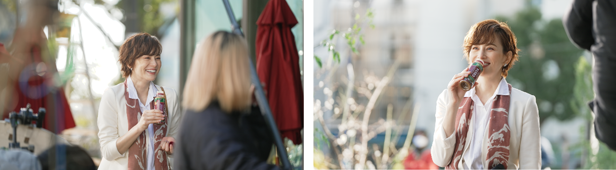 カフェをバックに新しくなった「コスタコーヒー」の香りの良さに驚き笑顔を見せるシーンの撮影では、横から送風機で風を送るスタッフとのタイミングや位置がなかなか合わないハプニングに、思わず笑ってしまう場面も。落ち着いて何度かタイミングを合わせた後には、息の合った演技を見せてくれました。