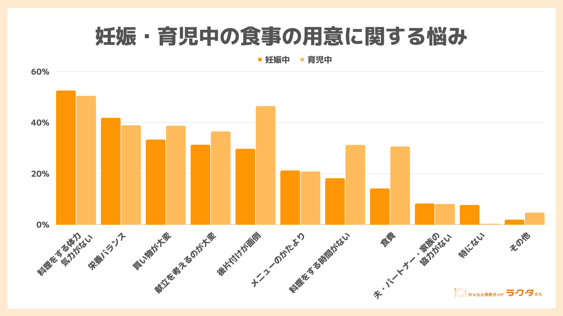 妊娠中・育児中のときの食事の用意に関する悩みを尋ねたところ、最多は「料理をする体力・気力がない」。約半数が料理をすること自体に苦労されているようです。