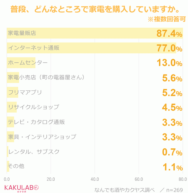 まず、普段どんなところで家電を購入しているかを複数回答可で聞いてみました。最も多かったのは「家電量販店」で87%。次いで、「インターネット通販」が77%、「ホームセンター」が13%と続き、「町の電器屋さん」こと「家電小売店」は6%にとどまりました。