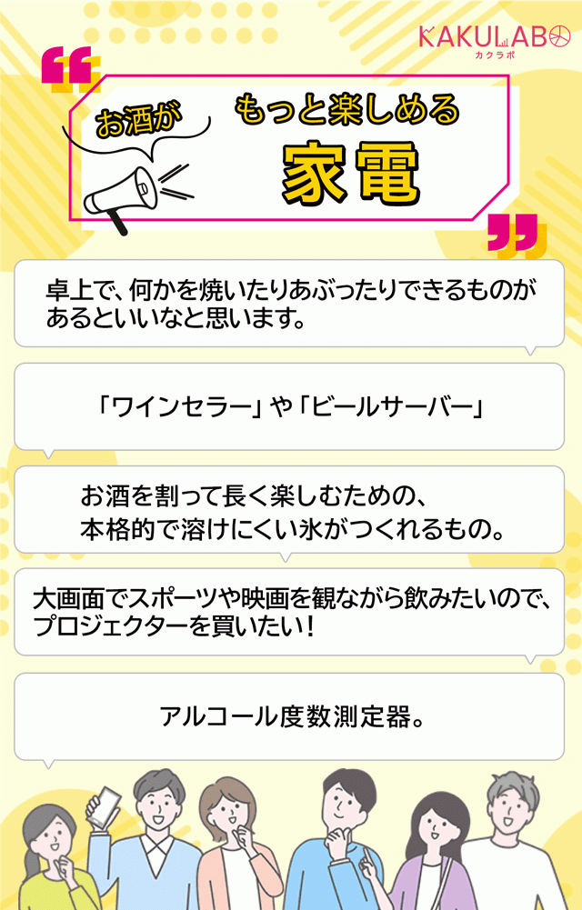 今回、お酒を楽しむために買いたい家電や、「あったらいいな」と思う家電について募集したところ、さまざまな意見が寄せられました。