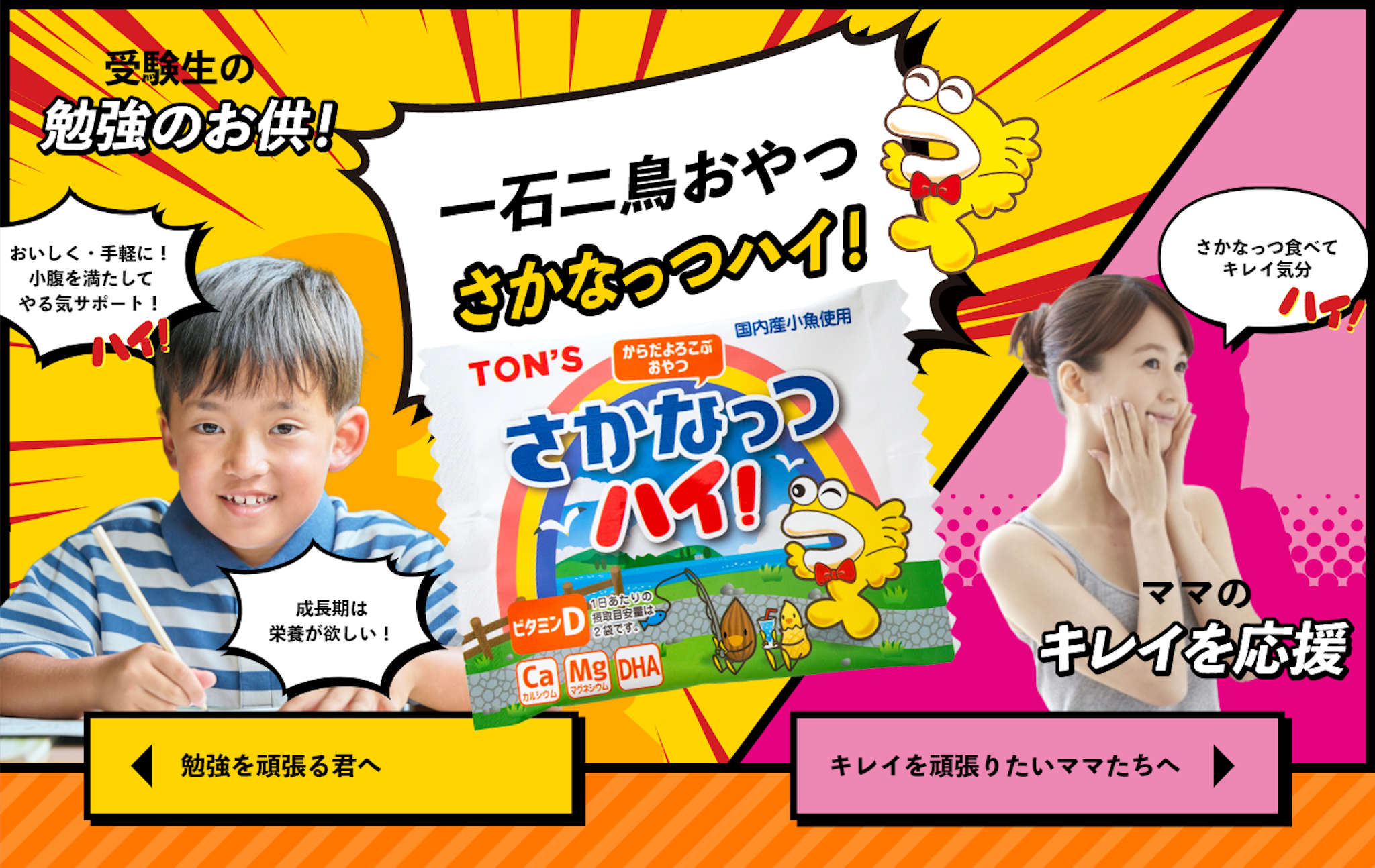 東洋ナッツ食品株式会社(兵庫県神戸市東灘区深江浜町30番地)が展開するロングセラー商品『さかなっつハイ!』は、これまで給食のおやつとして多くの方々に親しまれてきました。この度、販売拡大戦略として受験お菓子市場とママの美容市場に参入。“一石二鳥おやつ”として表舞台への進出を狙います。それに伴い、3月9日(木)より新たな施策を始動します。第一弾として、専用特設ページを立ち上げるとともに、さかなっつハイ!の宣誓動画を公開。今後のさかなっつハイ!に是非ご期待ください。
