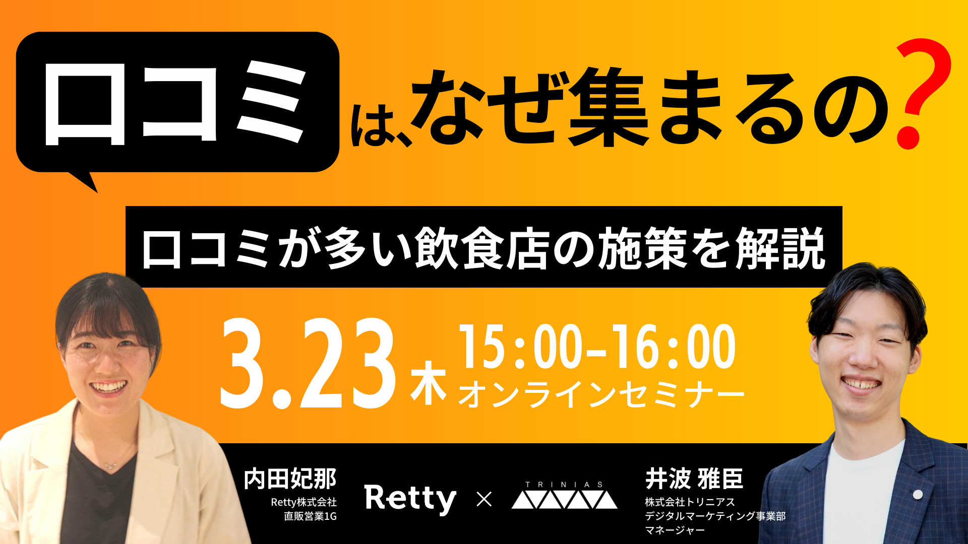 実名口コミグルメサービス「Retty」を運営するRetty株式会社(本社:東京都港区、代表取締役:武田 和也)は、株式会社トリニアス(本社:東京都新宿区、代表取締役:山口 慎一郎)と共催で、飲食店向けWebセミナー「なぜ口コミは集まるの?口コミが多い飲食店が実施している施策を解説」を3月23日(木)15:00〜16:00で開催します。Rettyは飲食店のみなさまがよりよい集客を実現し、Happyな食体験を生み続けられるようサポートしてまいります。