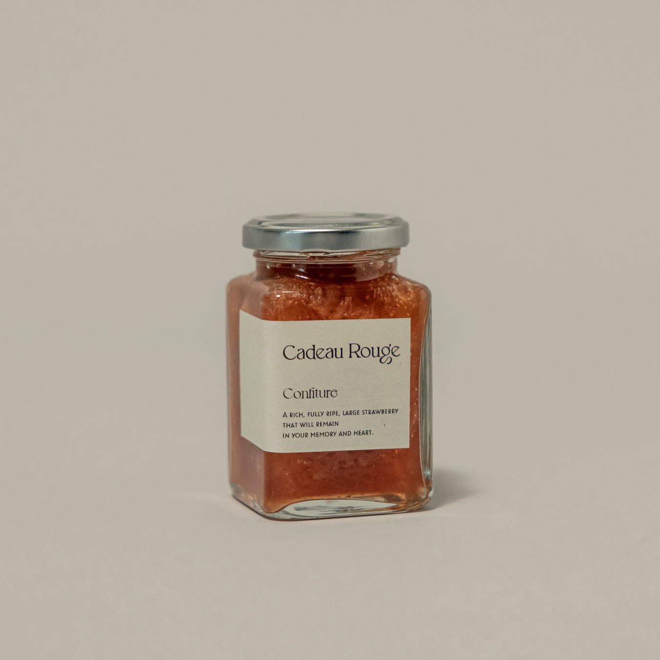 <Cadeau Rouge>のイチゴの果肉と果汁を余すことなく使って煮込んだコンフィチュール。果肉の食感や鮮やかな赤色、フレッシュな味などそのまま再現しました。素材のみずみずしさを活かすために、2種類の砂糖をブレンドしながらも糖度を必要最低限に留めキレのある甘さに仕上げています。焼きたてのスコーンやパンにたっぷりと乗せてお召し上がりください。