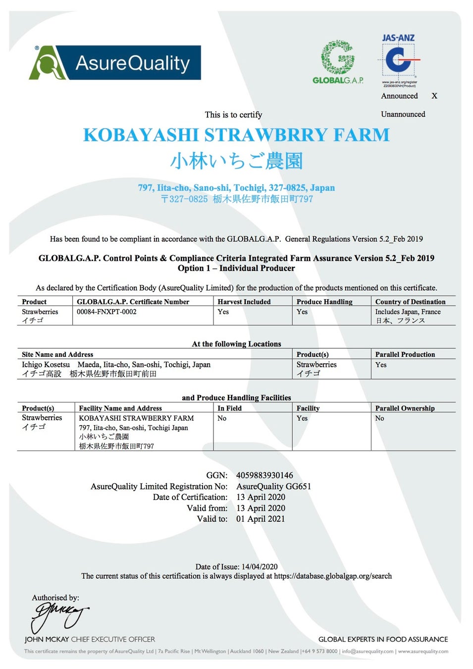 ※3 “食品安全”・“労働環境”・“環境保全”に配慮しながら生産活動を行なっていることを証明する国際基準の仕組み。(株)KSFは2019年に取得。