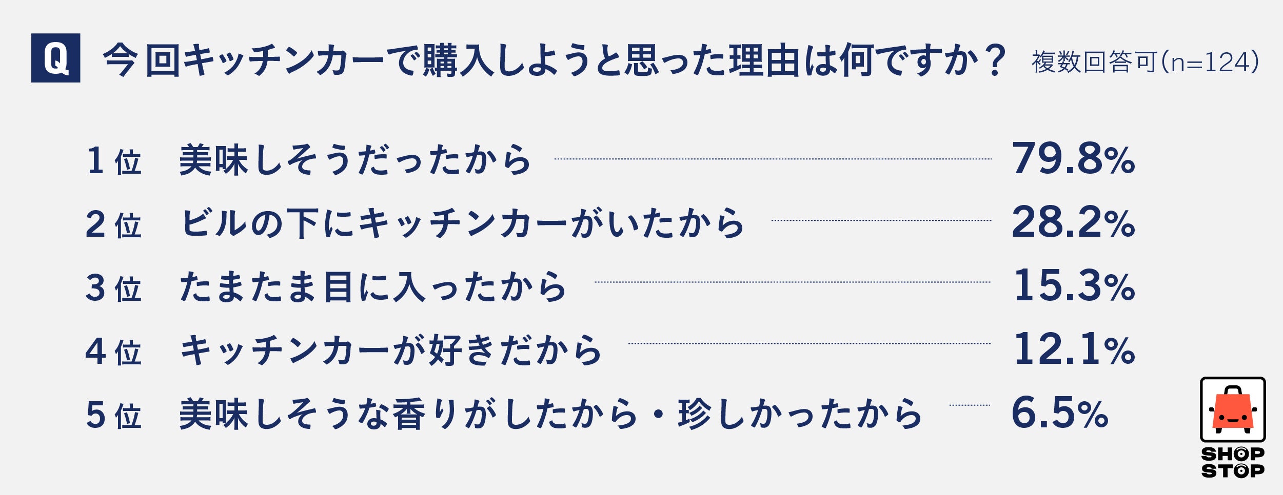 「美味しそうだったから」「たまたま目に入ったから」など、キッチンカーによって広場の雰囲気が変わったことで、偶発的な顧客の行動を引き起こしていることがアンケート回答から伺えます。