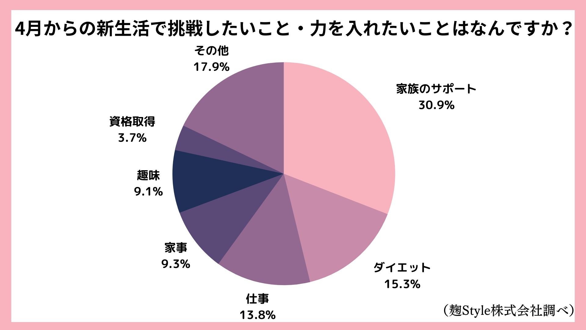 また、新生活で挑戦したいこと・力を入れたいことに対する回答では、回答者本人自身のスキルアップなどではなく「家族のサポート」が3割を占めるという結果となりました。