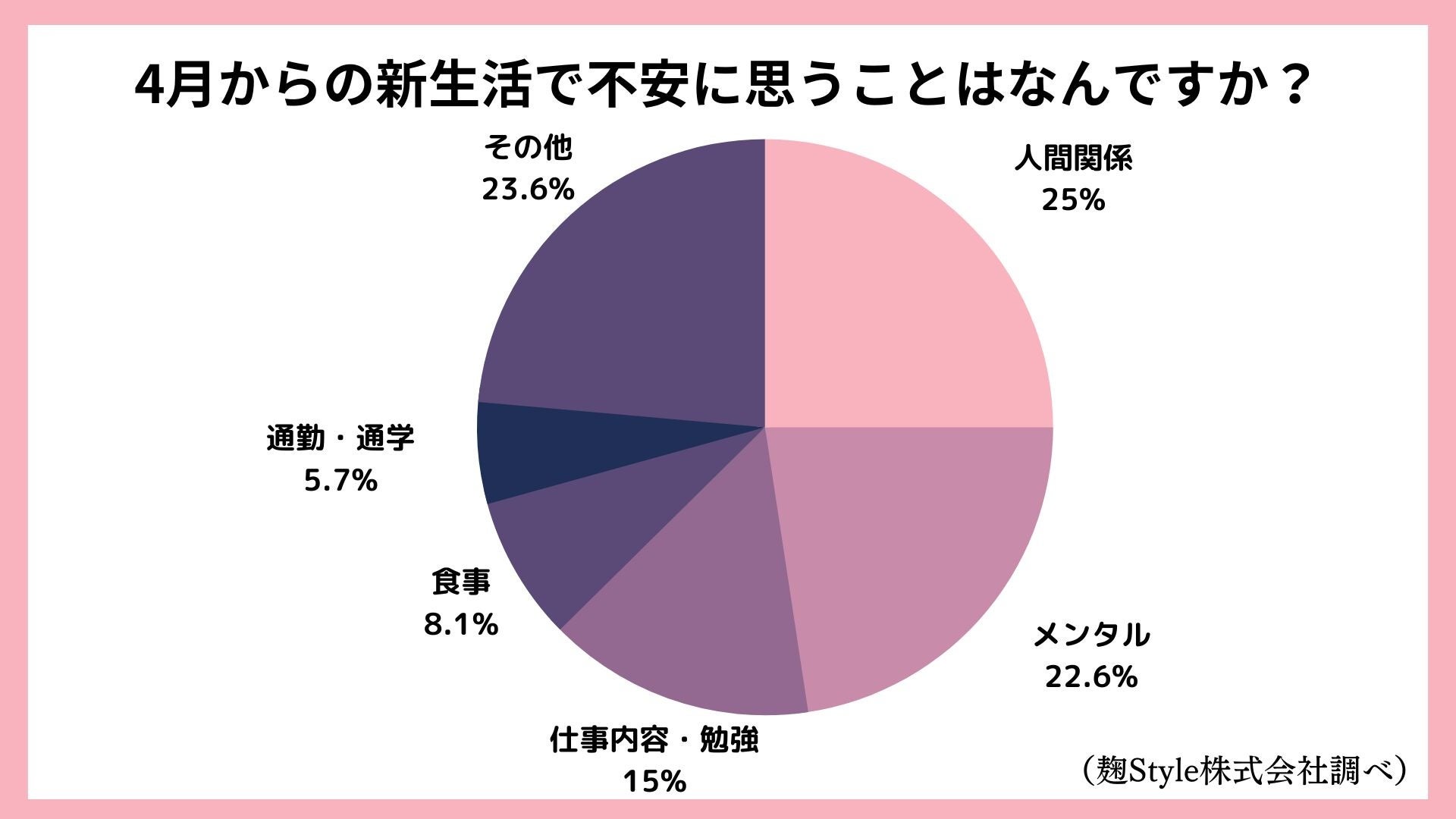 「4月からの新生活で不安に思うことはなんですか?」という問いに対して「人間関係」と回答した人は25%、次いで「メンタル」と回答した人が22.6%と全体の約5割を占めました。