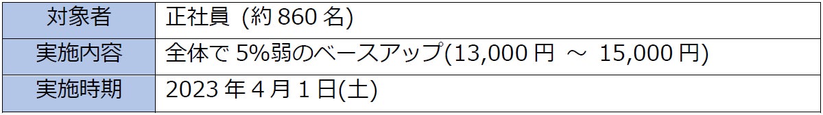 2022年度の売上高は、新型コロナウイルス感染症の再拡大による影響をうけながらも、短縮していた店舗の営業時間延長、各種販促キャンペーンなどにより、徐々に回復してきました。今回のベースアップは、社員ひとりひとりが安心して働ける環境を整える為に実施します。定期昇格による給与の引き上げを含めた昇給率は全体で5%強となり、最大45万円の特別感謝金(2/28支給済み)を含めると昇給率は、全体で6%強となります。