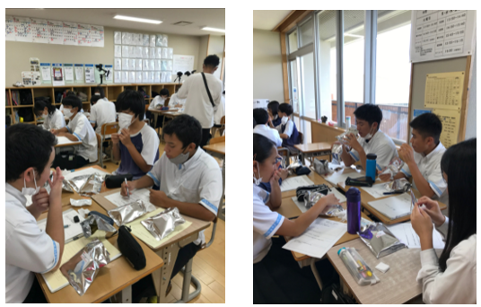 グループに分かれて特産品「アーサ」に合わせる味のアイデアを出し合いました。生徒から出たアイデアの中からカルビーが3つの味を試作。最終的な味付けは生徒たちが実際に試食して投票で決定しました。また、それに合わせて味名も考えました。