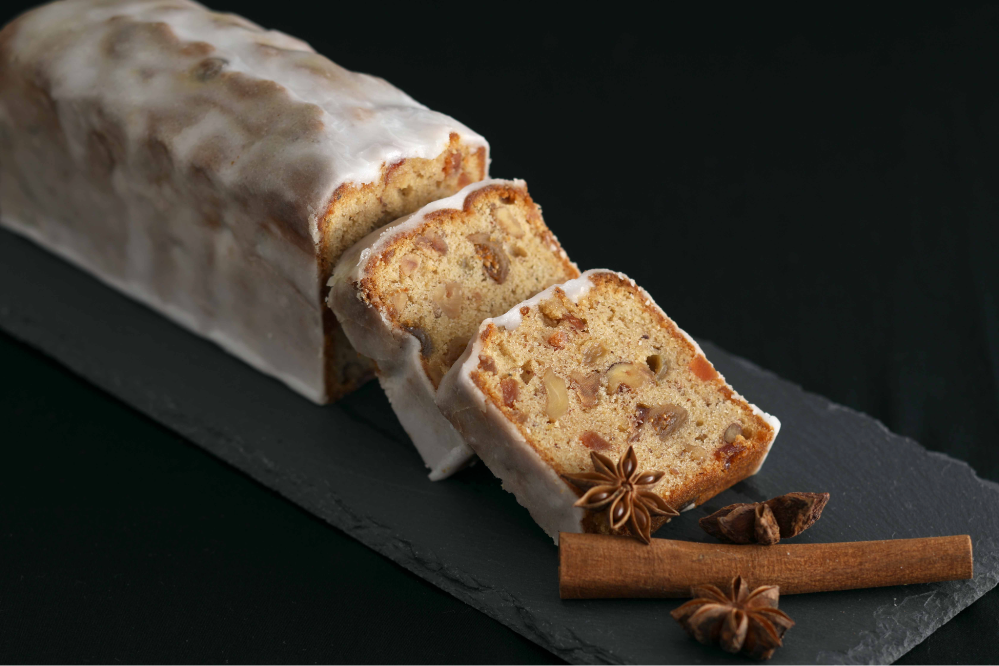 沢山のドライフルーツを洋酒に漬け込むこと数ヶ月…それらをたっぷりのクルミと合わせ、 しっかりとスパイス(シナモン・ナツメグ・クローブ)を効かせて焼きあげました。