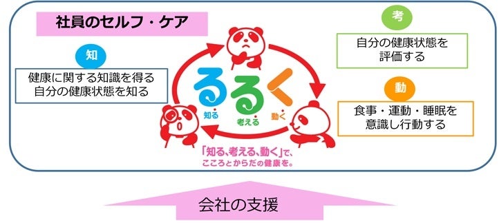 当社グループでは、従業員とその家族の健康が最も重要な経営基盤の一つと考え、職場の栄養改善やセルフ・ケアの維持向上のための施策を展開しており、「味の素グループで働いていると、自然に健康になる」ことを目指し、従業員が「知る、考える、動く」のるるく®サイクルをまわすことでセルフ・ケア能力を高めることを支援しています。