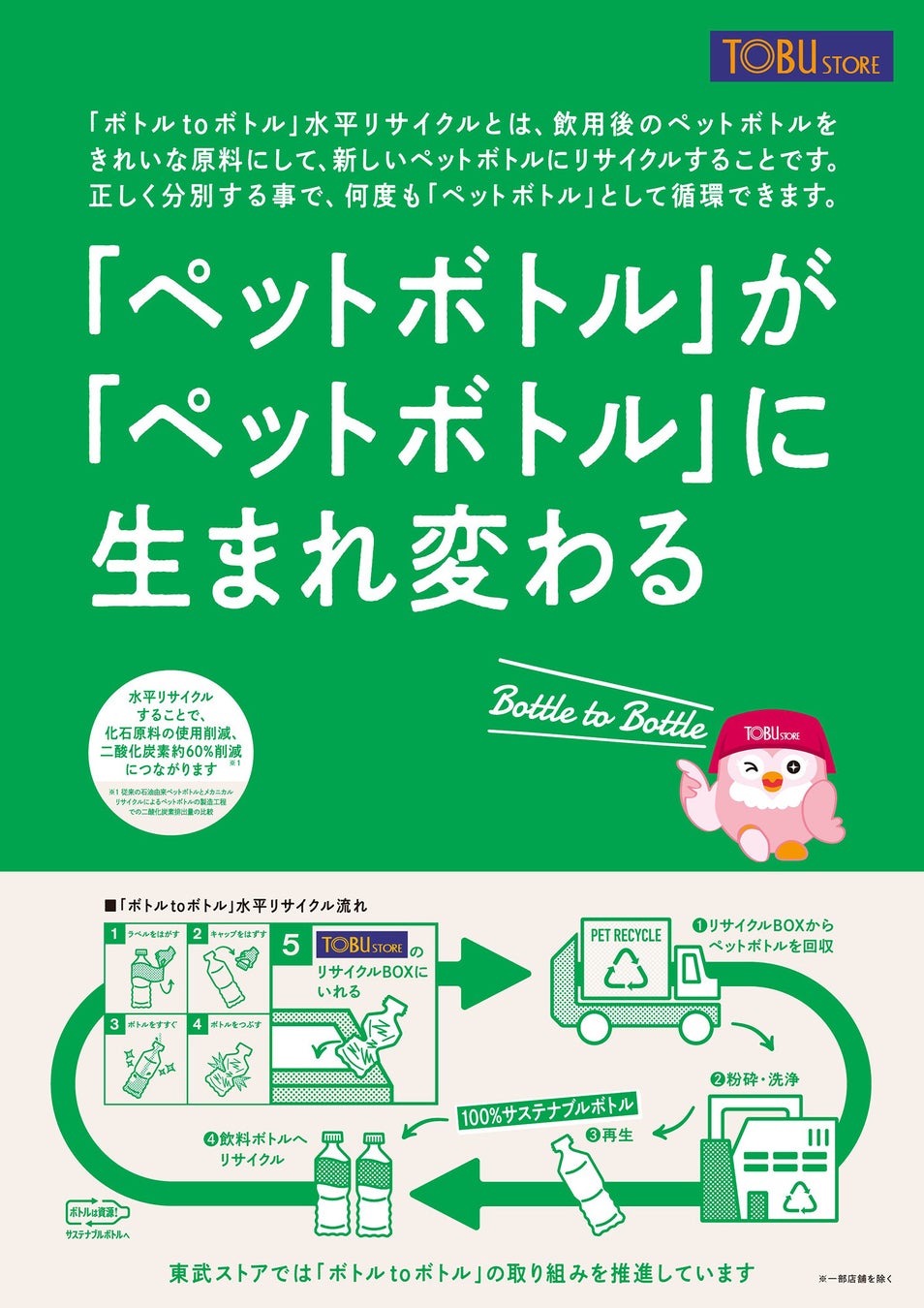 東武ストアの対象店舗で回収した使用済みペットボトルを当社の飲料用ペットボトル容器として再生・使用していきます。これにより、お客さまのご協力により集められた使用済みペットボトルを新たなペットボトルに生まれ変わらせる、「ボトルtoボトル」水平リサイクルを実現します。また、東武ストアでは、お客さまの水平リサイクルの取り組みへの参加促進を目的に、売り場と連動した取り組み告知を展開し、「リサイクルの見える化」を推進し、地域のお客様と共に、資源の有効活用を推進します。