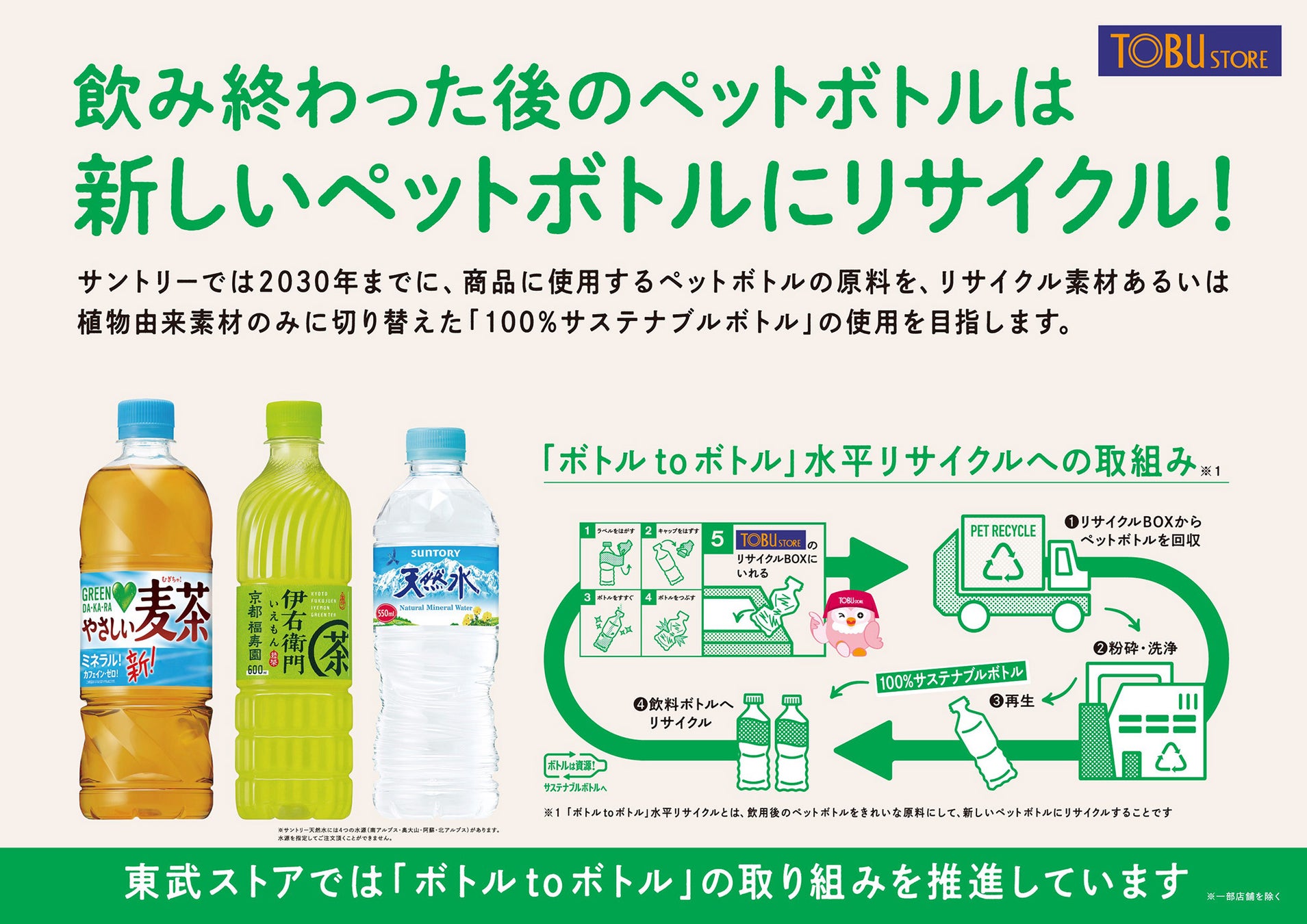サントリー食品インターナショナル株式会社は、株式会社東武ストア(以下、「東武ストア」)と協働し、東武ストアの45店舗を対象に、店頭で集められた使用済みペットボトルを回収して新たなペットボトルに生まれ変わらせる「ボトルtoボトル」水平リサイクル※1を3月10日(金)より開始します。