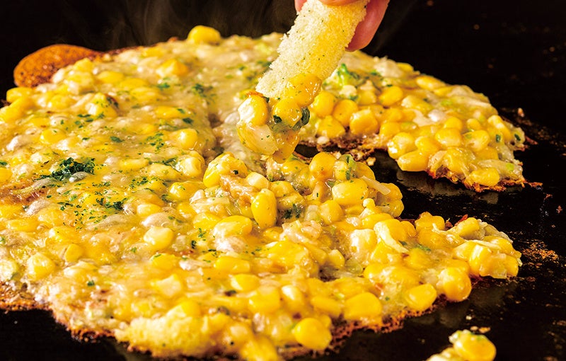 「うまい棒」でディップして食べる「コーンポタージュ風」もんじゃ焼きです。