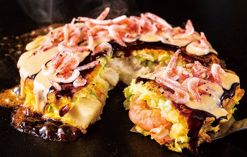 豪華な「ミックス好み焼き」に、「お好みソース」と「濃厚エビマヨネーズ」「さくらエビ」をトッピングした、