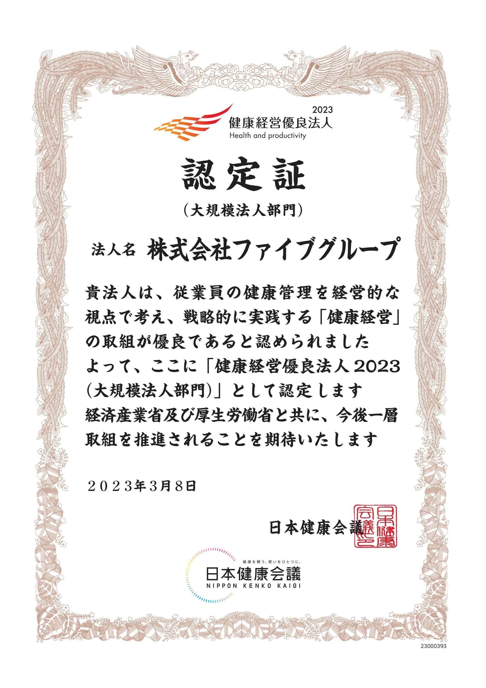 「”楽しい”でつながる世界をつくる」をミッションに、飲食店などを運営している株式会社ファイブグループ(本社:東京都武蔵野市 代表取締役社長:坂本憲史 以下ファイブグループ)は、2023年3月8日に経済産業省が推進する「健康経営優良法人2023」(大規模法人部門)の認定を受けました。この制度は従業員の健康管理を経営的な視点で考える健康経営を、戦略的に実践している法人を顕彰するもので、今年で6年連続での認定となりました。