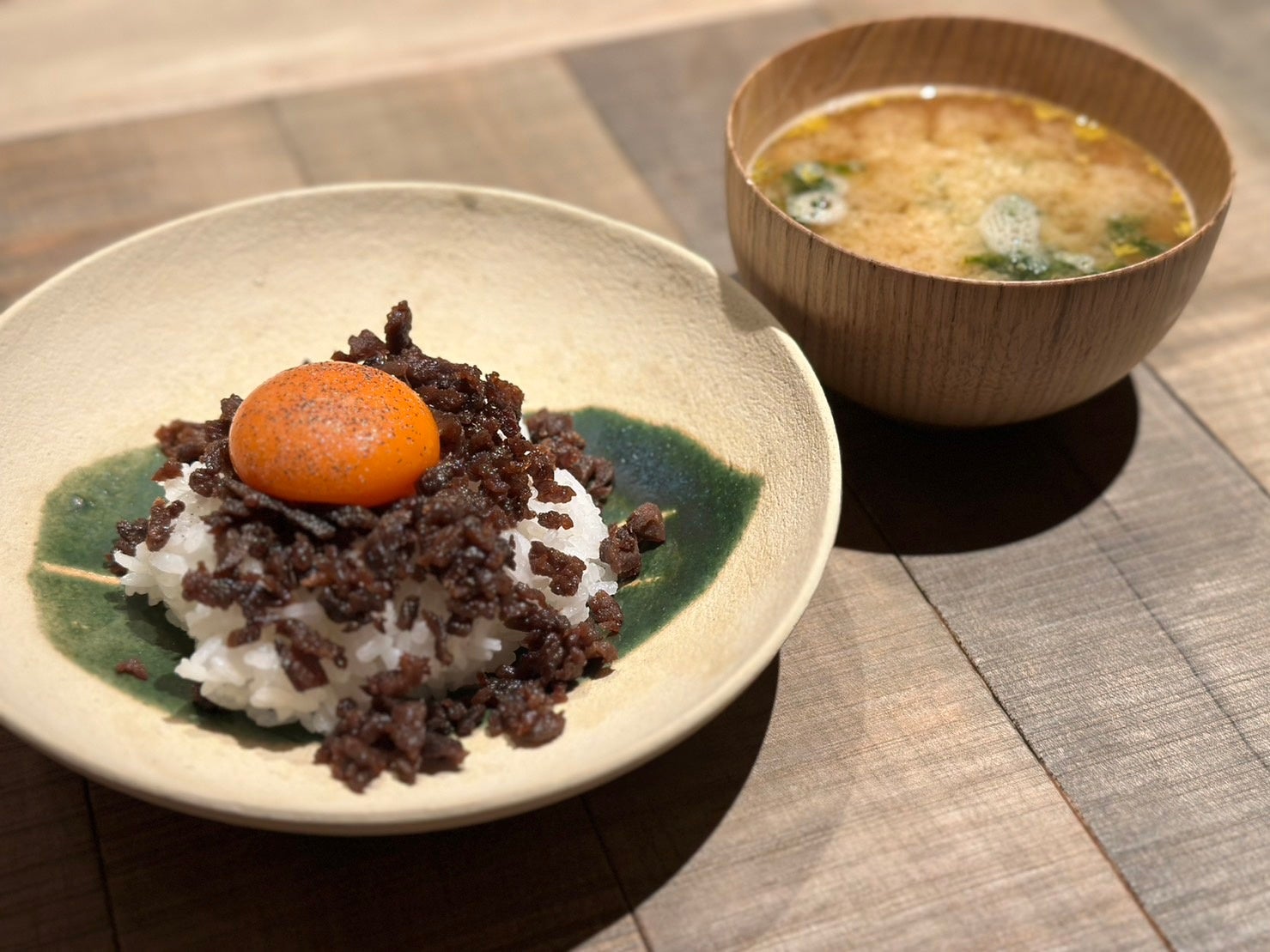 ※甘辛く煮たサーロインとタンのそぼろがご飯と相性抜群で、伊勢海老のミソの出汁がよく効いた一品です。
