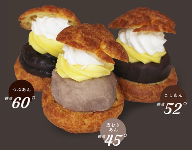 「あんこの勝ち」の一番の楽しさはあんこの種類を選べること。3種類のあんこをご用意し、つぶあん(糖度60°)・こしあん(糖度52°)・皮むきあん(糖度45°)とそれぞれ異なる糖度が設定されています。