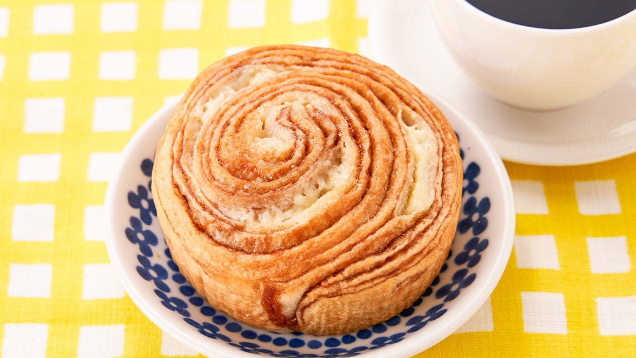 シナモンとバナナ風味のクリームをパンに巻き込み、ふんわりと焼き上げました。