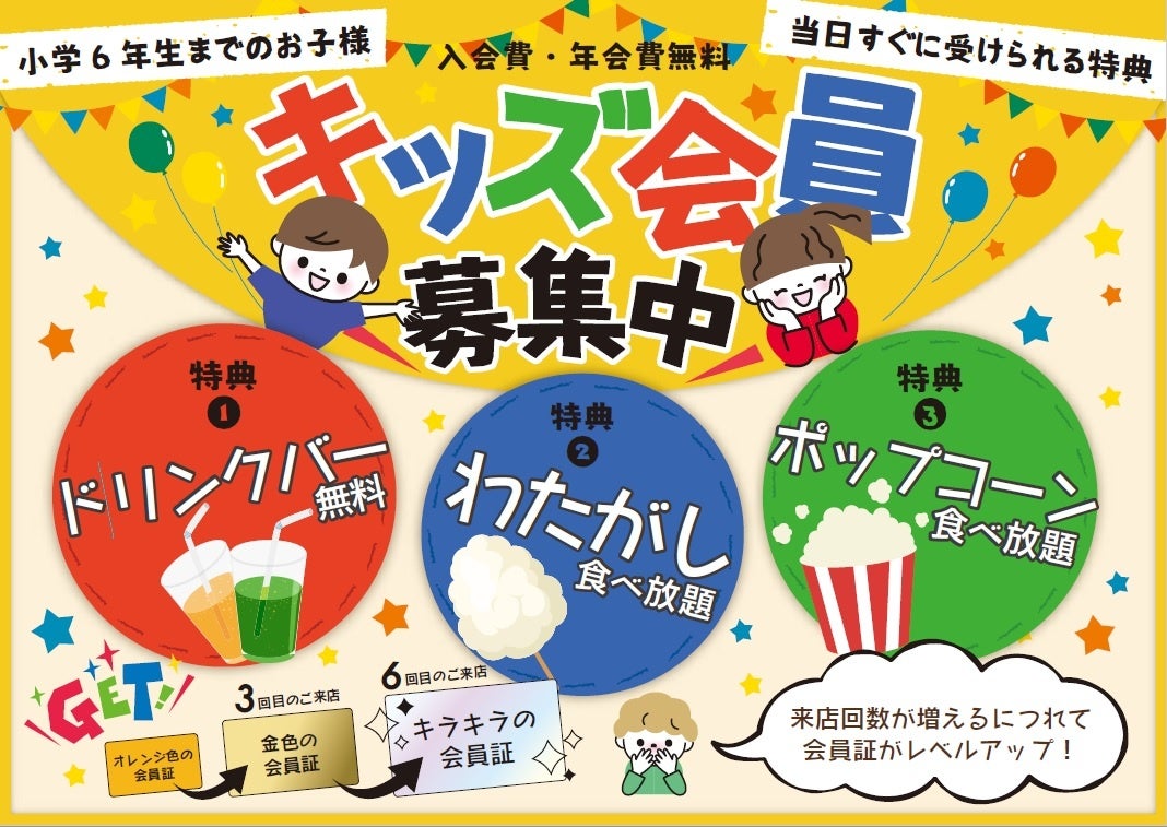 『焼肉ホルモンたけ田』はお子様大歓迎。小学6年生まで無料でご利用いただける、ドリンクバー、自分で作るわたがし、ポップコーンをご用意いたしました。
