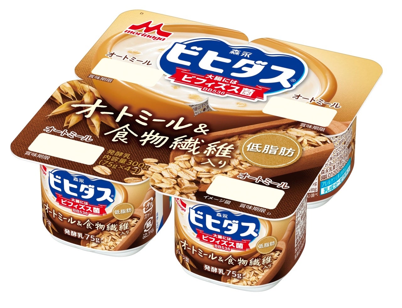 今回、新発売する「ビヒダス ヨーグルト オートミール&食物繊維入り 4ポット」は、健康素材として注目度が高まっているオートミールと、ビフィズス菌とともにおなかにうれしい食物繊維入りのヨーグルトです。これまでフルーツをメインに展開してきた「ビヒダス ヨーグルト 4ポット」シリーズより、新たな健康価値とおいしさをご提供します。低脂肪設計(※2)で、脂肪分が気になる方でも継続的にお召しあがりいただけます。また、オートミールのつぶつぶとした食感もお楽しみいただけます。