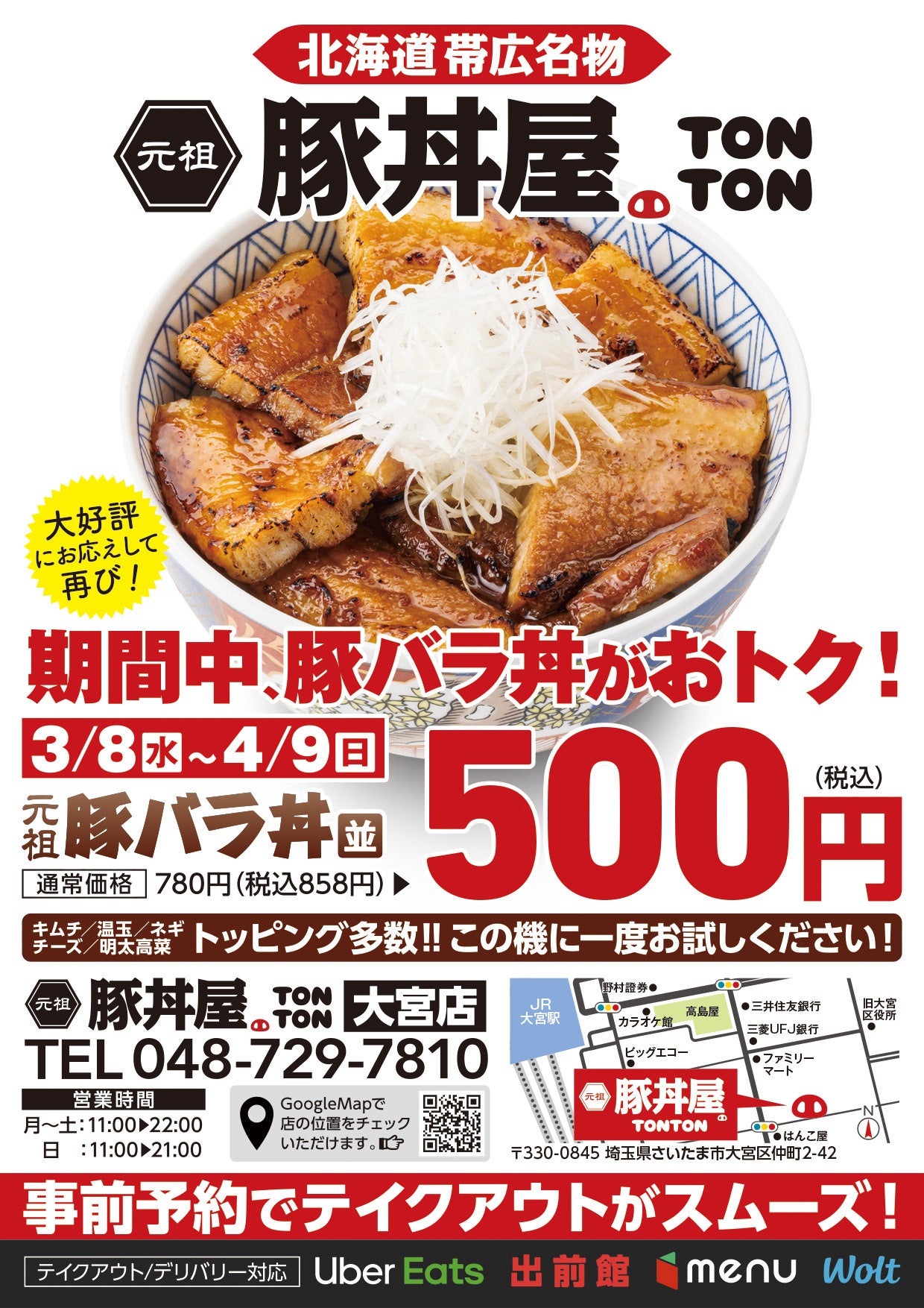 ボリュームたっぷりの北海道・帯広豚丼が人気の「元祖豚丼屋TONTON 大宮店」(住所:埼玉県さいたま市大宮区仲町2-42、TEL:048-729-7810)では、前回大好評いただいたキャンペーンをご要望にお応えして、4月9日(日)までの期間中「豚バラ丼【並】」を期間限定価格500円(税込)で再び提供いたします。