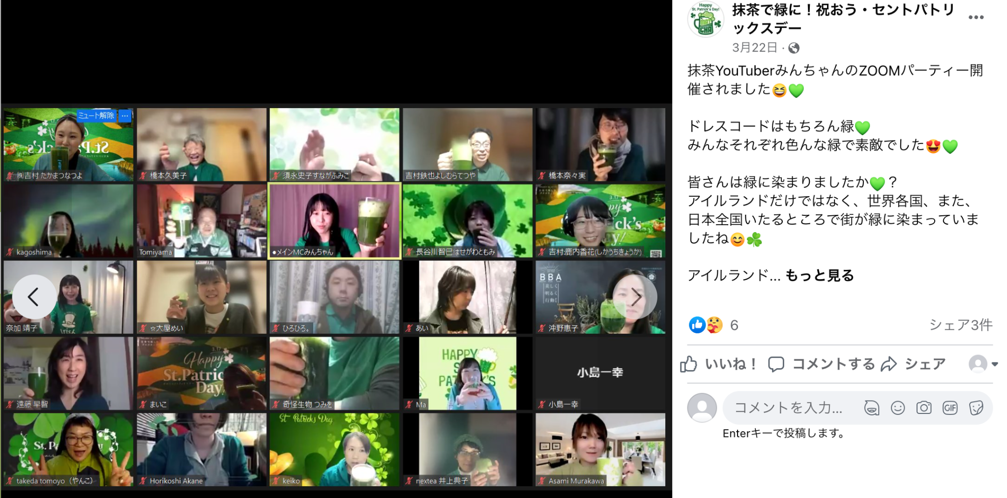昨年初の取り組みはコロナ禍のため、オンラインで抹茶loverやアイリッシュファンの皆さんと一緒に乾杯イベントを行いました。