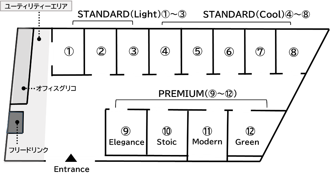 | 個室タイプ | STANDARD 「Light」「Cool」 8席 | PREMIUM 「Green」、「Stoic」、「Elegance」、「Modern」4席 |
