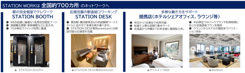 2019年8月に開業したJR東日本のシェアオフィス STATION WORK は、「働く人の“1秒”を大切に」を事業コンセプトに多様な働き方をサポートしており、全国約700カ所のネットワークとなります。駅の便利なワーキングブースSTATION BOOTHはもちろん、WeWorkなどのラウンジやホテルシェアオフィスといった各種アライアンスを強化していきます。2023年度1,000カ所体制に向けて、今後もスピーディーに拠点拡大を進めます。
