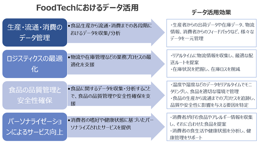 生産・流通・消費のデータ管理、ロジスティクスの最適化、食品の品質管理と安全性確保、パーソナライゼーションによるサービス向上を図ることができます。