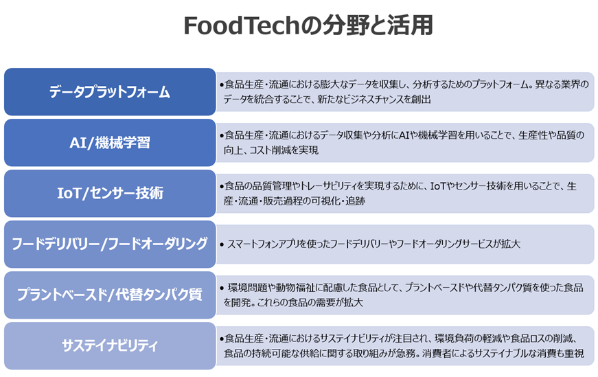 食品ロスの削減や食糧不安の解決など、社会的課題の解決にも貢献し、FoodTechは、持続可能な社会の実現に向けた重要な技術分野となっています。