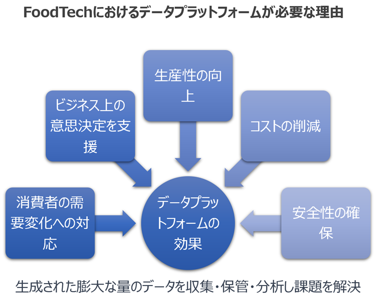 フードデータを保存、共有、活用するためのデータプラットデータプラットフォームの導入により、消費者の 需要変化への対応、ビジネス上の意思決定を支援、生産性の向上、コストの削減、安全性の確保など多岐に渡って効果があります。
