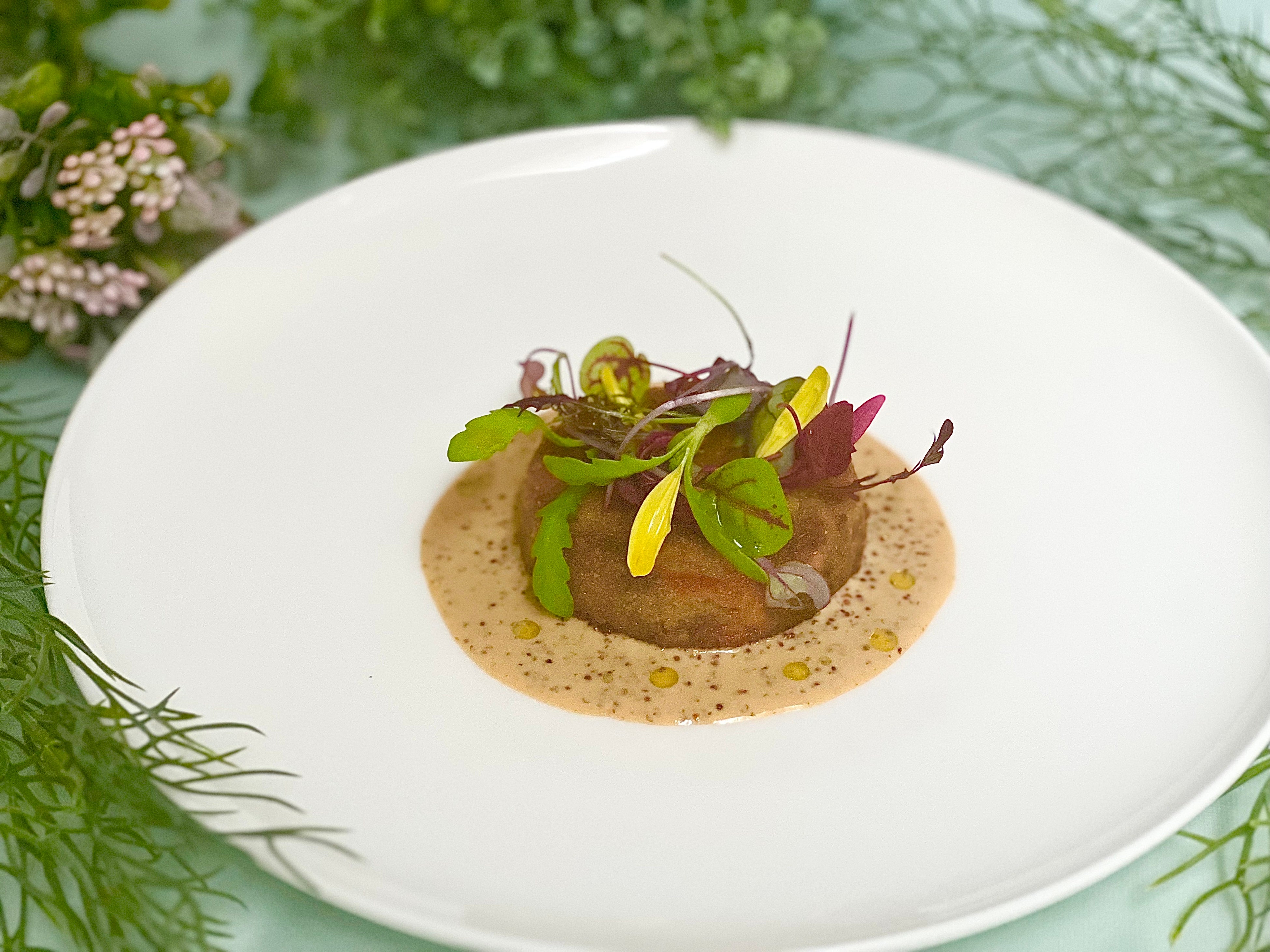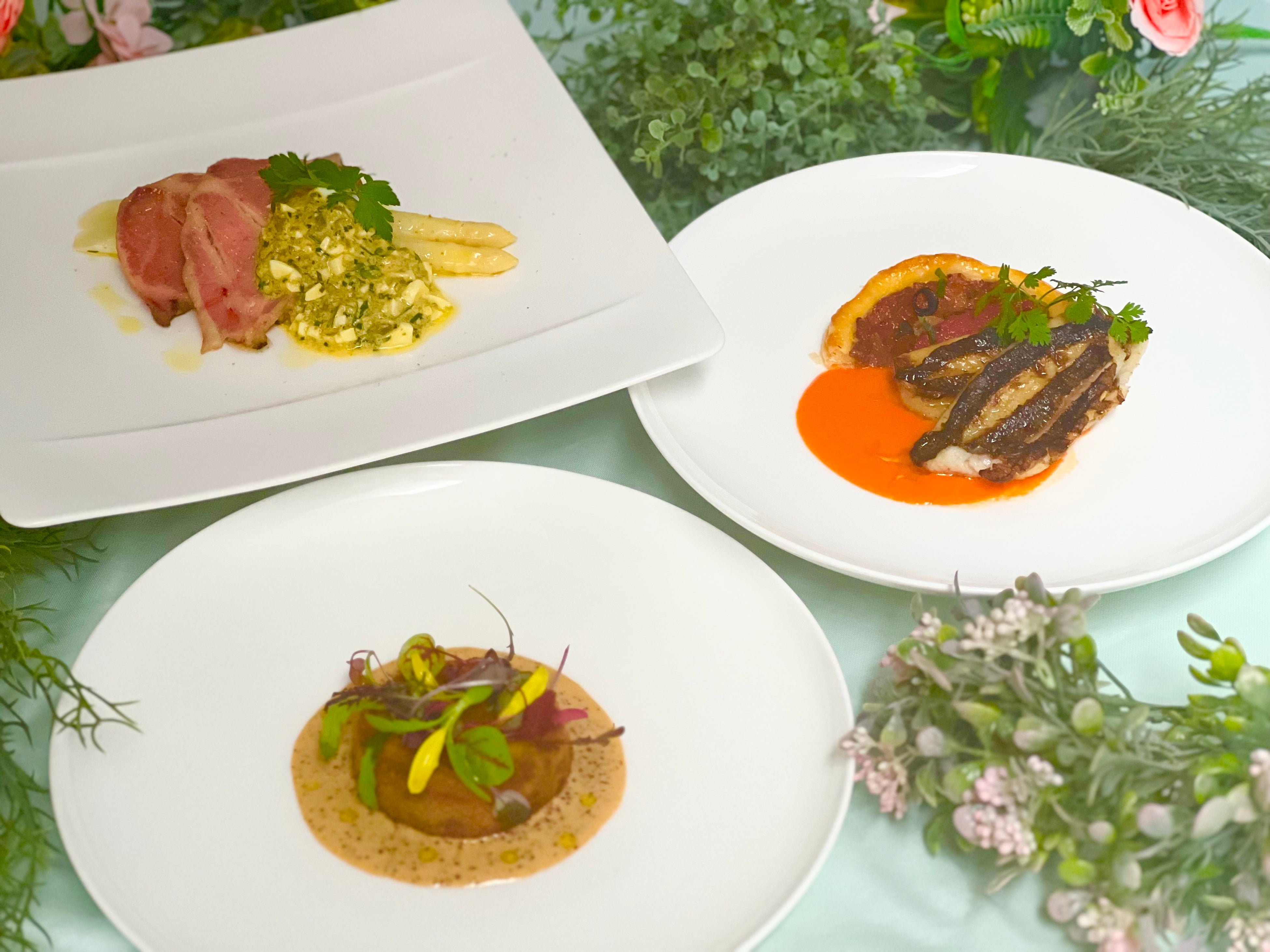 ≪愛知みかわ豚肩ロース肉の低温調理、ホワイトアスパラガス添え グリビッシュソース≫