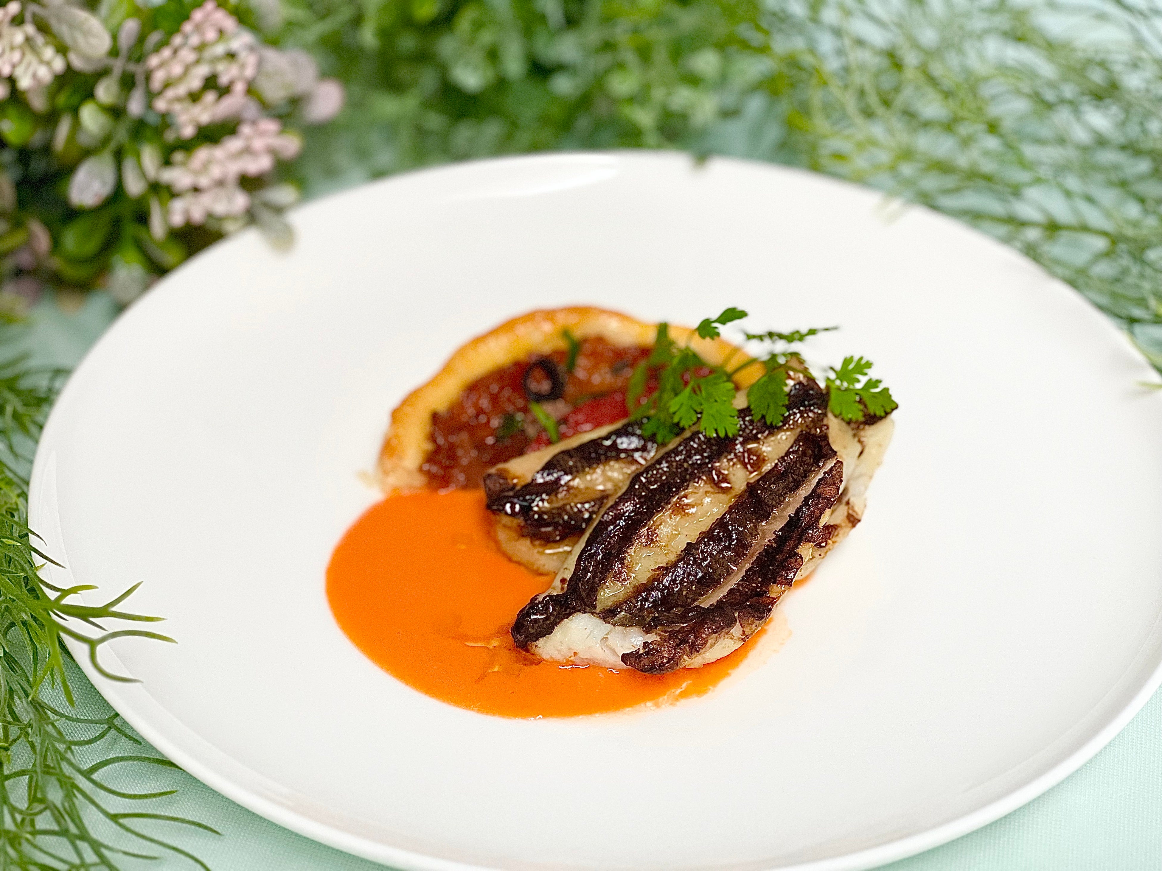 ≪愛知県産メバルのグリル、ピッサラディエール 赤ピーマンソース≫