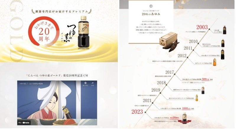 株式会社にんべん(東京都中央区、代表取締役社長 髙津伊兵衛)が製造する「つゆの素ゴールド」は発売から20周年を迎えます。この度、他の商品にはない「つゆの素ゴールド」の美味しさをより多くの方々にお届けするべく、見どころ満載の販促施策(キャンペーン)を実施いたします。この「キャンペーン」では3月15日(水)に開始する「Twitterオープンキャンペーン」をはじめ、Youtube・CM・テレビドラマ、特設サイトをご用意しました。