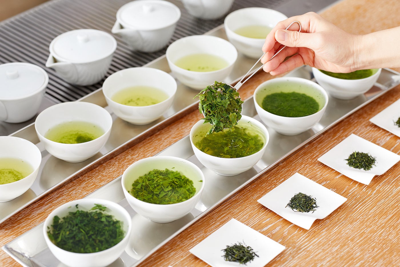 インターンシッププログラムでは、てぃぐり〜が日本橋の街を歩きながら、街の過去と現在を知る日本橋ツアーから始まります。ツアー後には山本山の本社オフィスを訪れ、てぃぐり〜が茶師になって異なる茶葉をブレンドして自分がイメージする煎茶を作る「合組体験会」を開催します。産地や火入れの異なる9種類の茶葉を用意。一つひとつのお茶をテイスティングしながら、それぞれの茶葉の持つ特徴を把握して、メンバー一人ひとりが目指す味、香り、水色を持った煎茶を作ることに挑戦します。